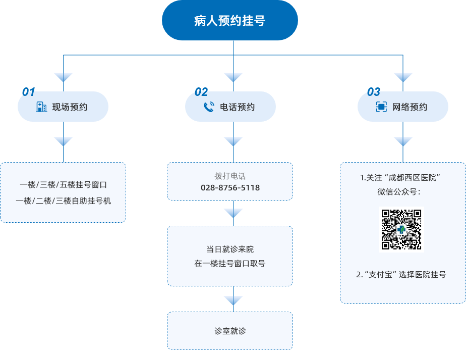 3.我院预约挂号可以在现场(人工窗口、自助机)、电话(87565118)、公众号“成都西区医院”微官网、支付宝APP挂号。